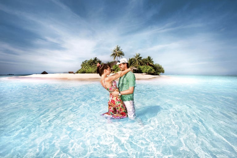 Фотографии вдвоём можно сделать на фоне моря, но особое настроение дарят колоритные локации острова: от гондол в Grand World до уединённых улочек в Sunset Town. Эти места будто созданы для тех, кто хочет стильную фотосессию на фоне живописной архитектуры.