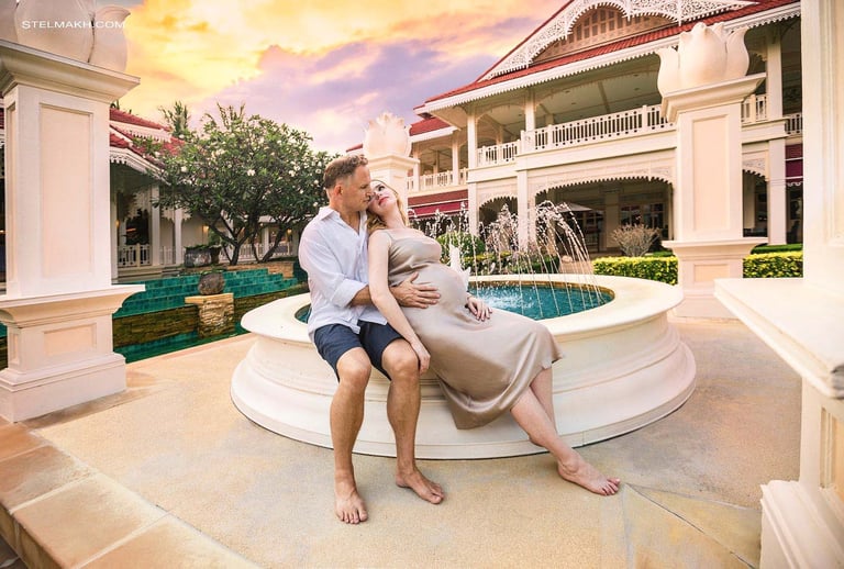 Белые дома, фонтаны и вид на море делают Sunset Town популярным местом для парных кадров. Отличный выбор для Love Story или годовщины.